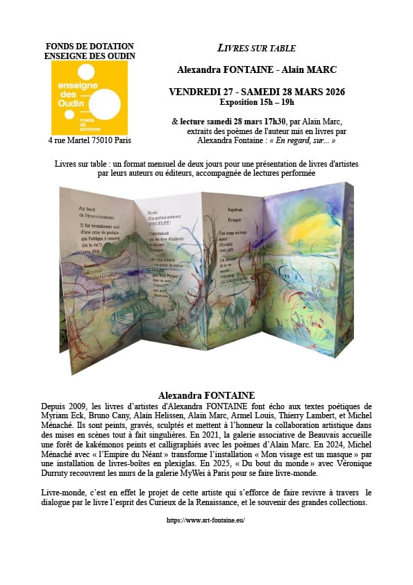 Depuis 2009, les livres d’artistes d’Alexandra FONTAINE font écho aux textes poétiques de Myriam Eck, Bruno Cany, Alain Helissen, Alain Marc, Armel Louis, Thierry Lambert, et Michel Ménaché. Ils sont peints, gravés, sculptés et mettent à l’honneur la collaboration artistique dans des mises en scènes tout à fait singulières. En 2021, la galerie associative de Beauvais accueille une forêt de kakémonos peints et calligraphiés avec les poèmes d’Alain Marc. En 2024, Michel Ménaché avec « l’Empire du Néant » transforme l’installation « Mon visage est un masque » par une installation de livres-boîtes en plexiglas. En 2025, « Du bout du monde » avec Véronique Durruty recouvrent les murs de la galerie MyWei à Paris pour se faire livre-monde.