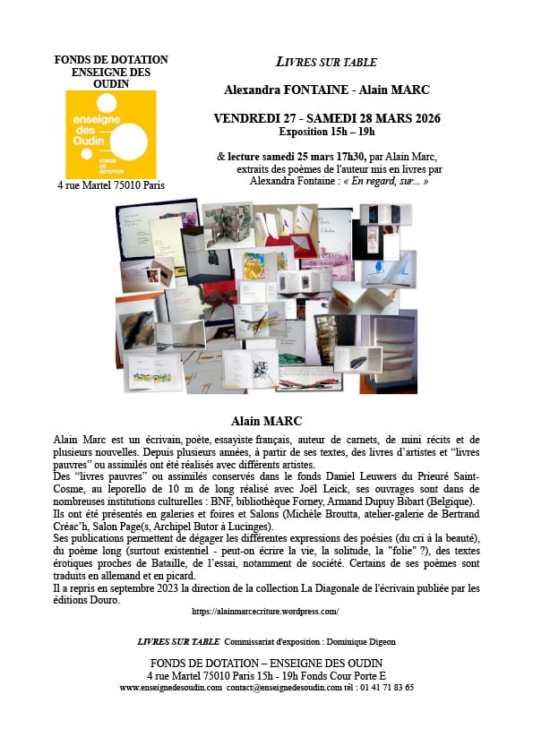 Alain Marc est un écrivain, poète, essayiste français, auteur de carnets, de mini récits et de plusieurs nouvelles. Depuis plusieurs années, à partir de ses textes, des livres d’artistes et “livres pauvres” ou assimilés ont été réalisés avec différents artistes.