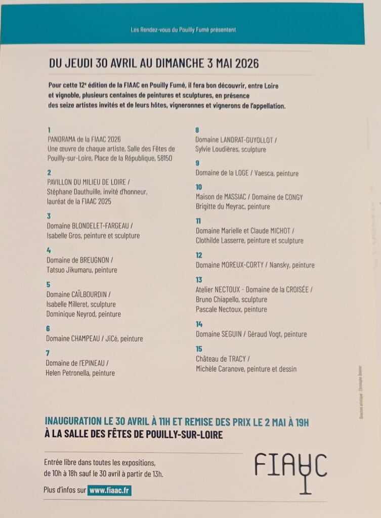 J’ai le plaisir de vous annoncer que j’exposerai prochainement une sélection de mes grandes toiles et sculptures dans le cadre prestigieux du chai du domaine Blondelet Fargeau. Cet événement s’inscrit dans la nouvelle édition de la FIAAC en Pouilly Fumé sur Loire.