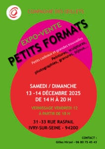 ![]() Objet : Expo-vente Petits Formats – Appel à candidatures La onzième édition des « Petits Formats » se tiendra le week-end des 13 et 14 décembre 2025 au sein des ateliers des 31-33 rue Raspail, à Ivry-sur-Seine Vous souhaitez exposer vos créations ? Posez votre candidature en envoyant quelques photos par mail à : gilles.hirzel@gmail.com […] |
