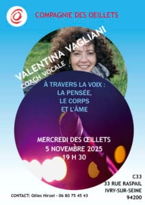 ![]() VALENTINA VAGLIANI Coach Vocal A l'écoute des voix La voix, parlons-en !, propose Valentina Vagliani pour ce mercredi 5 novembre 2025. Elle va nous faire entendre – démonstrations à l'appui – tout ce qui entre en jeu dans la pratique vocale : la pensée, le corps et l'âme. Quelques volontaires auront le privilège d'être appelés à donner […]  |