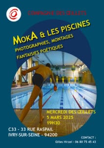 ![]() Mercredi des Œillets le 5 mars Le duo MokA est composé du graphiste Olivier Maître et de Karim Adjali, musicien, photographe et... maître-nageur. Les photographies oniriques issues de leur collaboration, sont pleines d'humour, de fantaisie et de poésie. Ce sont la plupart du temps des montages inspirés de l’imaginaire des nageurs, qui mêlent décors de […] |