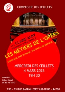 ![]() Claire Alby, scénariste et réalisatrice a conçu de courts films documentaires sur le monde de l’opéra et plus largement sur le monde artistique. Elle nous fera découvrir ou mieux connaître toutes sortes de métiers qui nous sont généralement mystérieux : le souffleur, le chef de chant, le chef d’orchestre, le costumier, le décorateur, le directeur d’opéra […] |