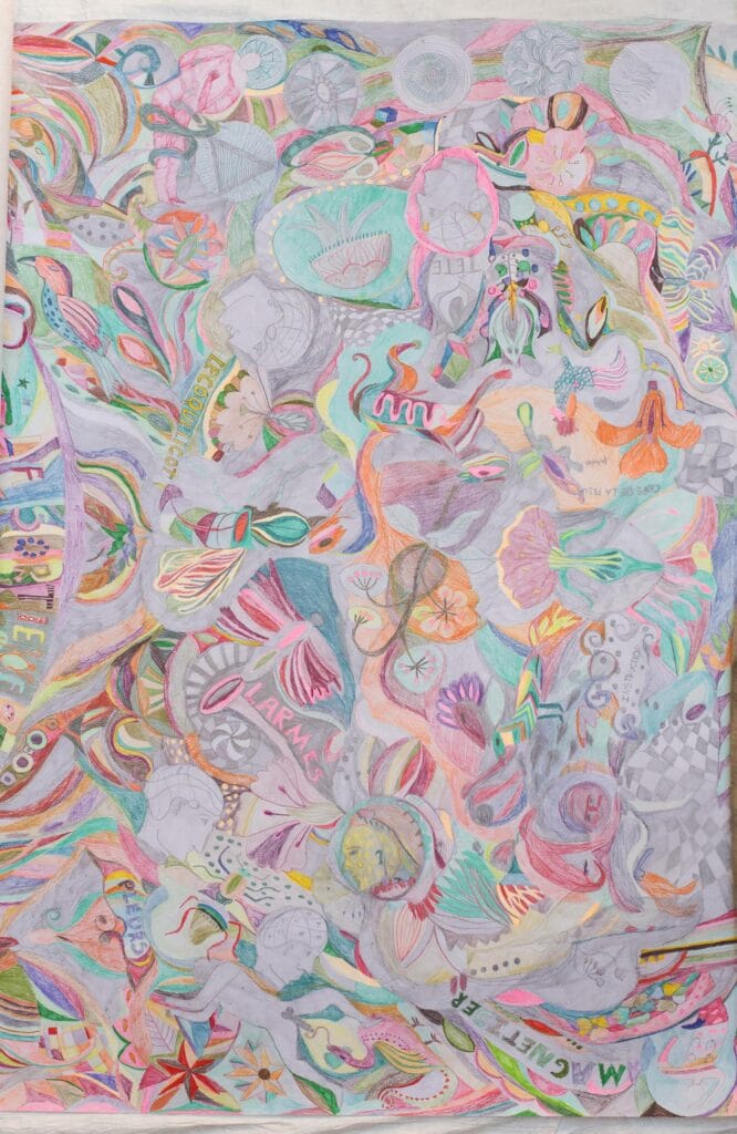 Elle crée sa propre cosmogonie en partant d’une forme de délire personnel dans lequel se mêlent expériences du réel, rêves et hallucinations, références, émotions et perceptions intimes du monde. Elle génère dans ses œuvres une forme de symbolisme bouillonnant dans lequel elle poursuit en particulier une réflexion sur la lumière, qu’elle place à l’origine de tout. De phénomènes naturels dont elle fait l’expérience intime, elle tire sa propre interprétation, une forme de traité empirique libre et non-codifiée au sujet de la manière dont les objets et les êtres reflètent, émanent, projettent et se transforment en récepteur de cette énergie merveilleuse.