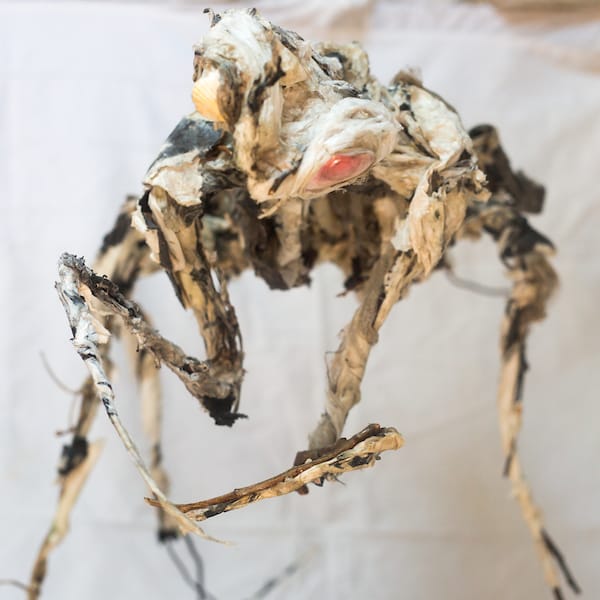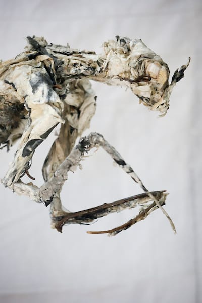 En 1998, après deux années passées au Japon auprès d’un maître de sculpture, je commence un bestiaire composé essentiellement d’oiseaux et d’insectes. Un bestiaire en papier charpenté de fil de fer et laissant apparaître ici et là des traces de lettres, de mots calligraphiés au pinceau, dernier souvenir de ce passage au pays du Soleil levant dont j’ai encore aujourd’hui la nostalgie. Si ce bestiaire est important pour moi c’est parce qu’il est symbolique d’une gestuelle ancestrale que je ne veux surtout pas oublier : l’unique trait de pinceau. Chaque animal en effet est fait de lignes, de ces lignes mouvantes qui disparaissent derrière les superpositions de papier et qui résultent de ce geste que j’ai appris avec Hiroschi Kumagai, mon professeur de sculpture au Japon et Toshiko Martin pour la calligraphie, en France.