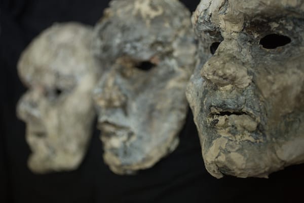 Mon travail sur les masques a débuté en 2015, en réponse à l’appel à insurrection artistique lancé par la compagnie théâtrale « Brut de Béton production ». Afin de commémorer la catastrophe de Fukushima, eurent lieu en effet le 11 mars 2015 à « La Parole errante » à Montreuil (93), des moments de réflexion, d’information, autour de mon installation intitulée : « Macka-Les cent masques ». Cent masques modelés comme des visages, et suspendus dans l’espace, tels une forêt de murmures en mémoire aux peuples ukrainiens et japonais, les grandes victimes de la catastrophe nucléaire.
